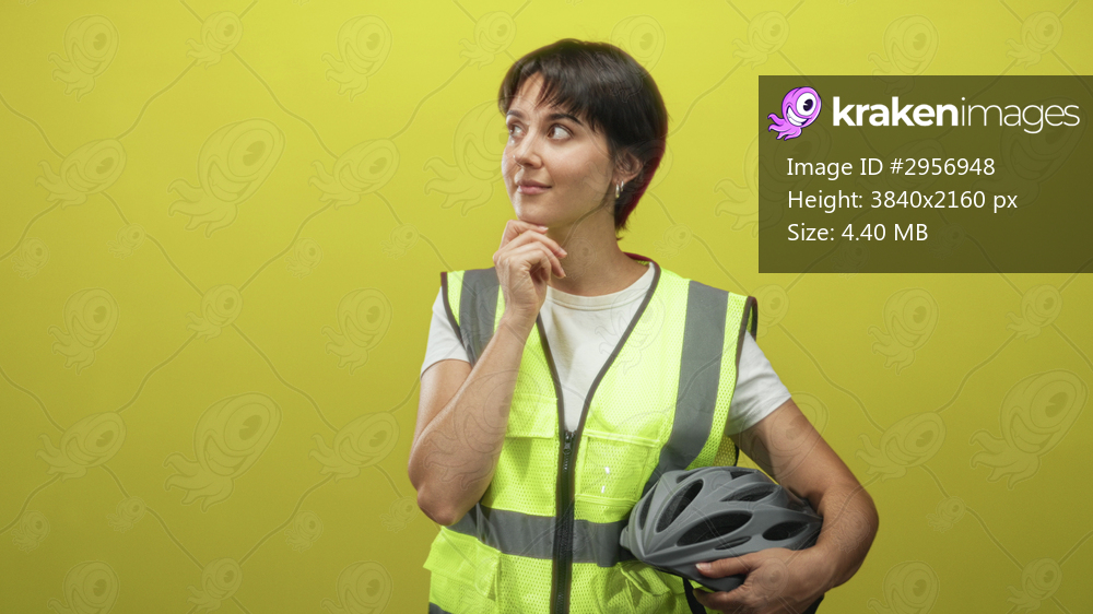 Woman wearing reflective vest, short hair, smiling, holding bicycle helmet and touching chin in studio; thoughtful safety.