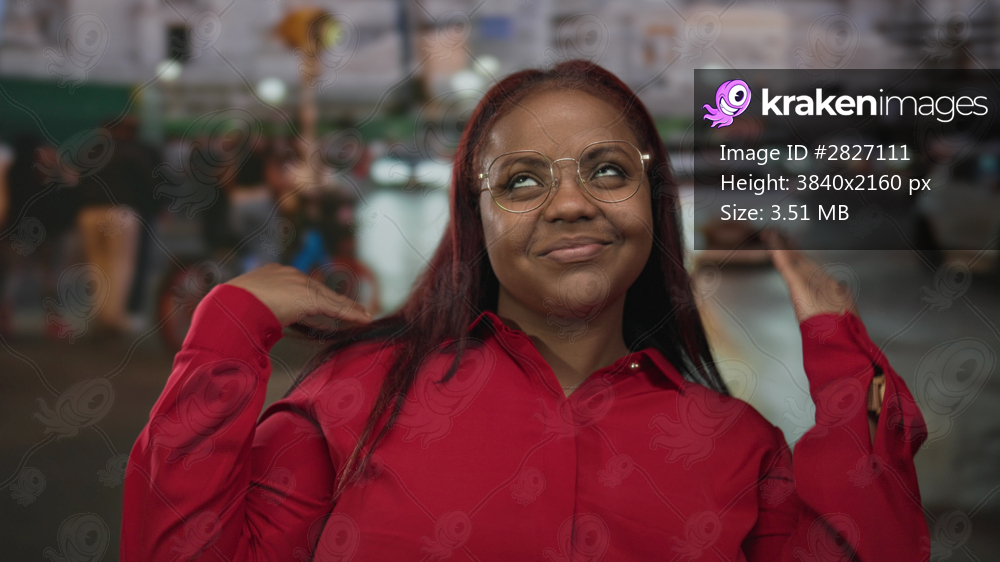 Woman wearing round glasses and red shirt adjusts long hair on a busy downtown city street; confidence empowerment.