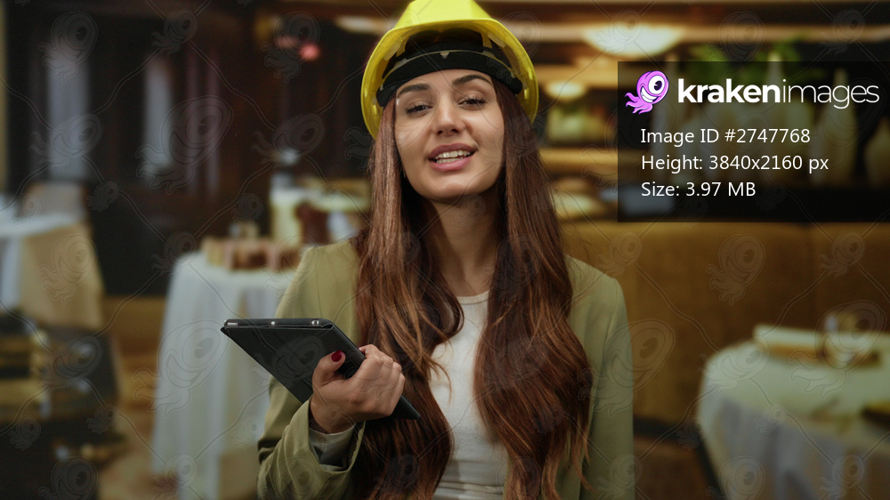 Woman wearing safety helmet holds tablet in restaurant setting, representing young hispanic architect or engineer discussing project indoors with stylish decor.