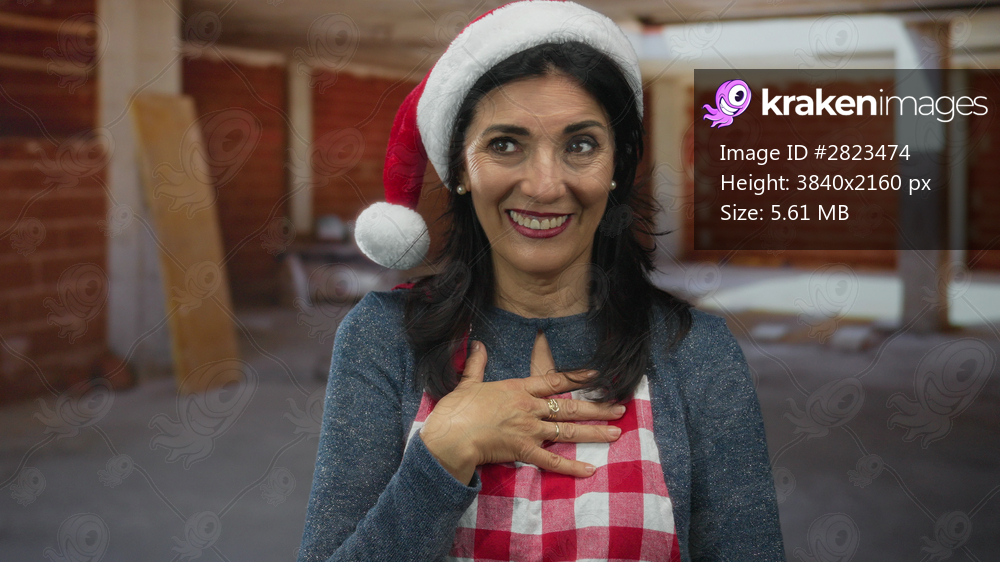 Woman wearing santa hat and checkered apron smiling with hand on chest inside unfinished building; holiday gratitude.