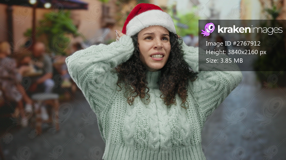 Woman wearing santa hat feeling stressed on cafe terrace with bustling street background suggests holiday overwhelm and urban life contrast.