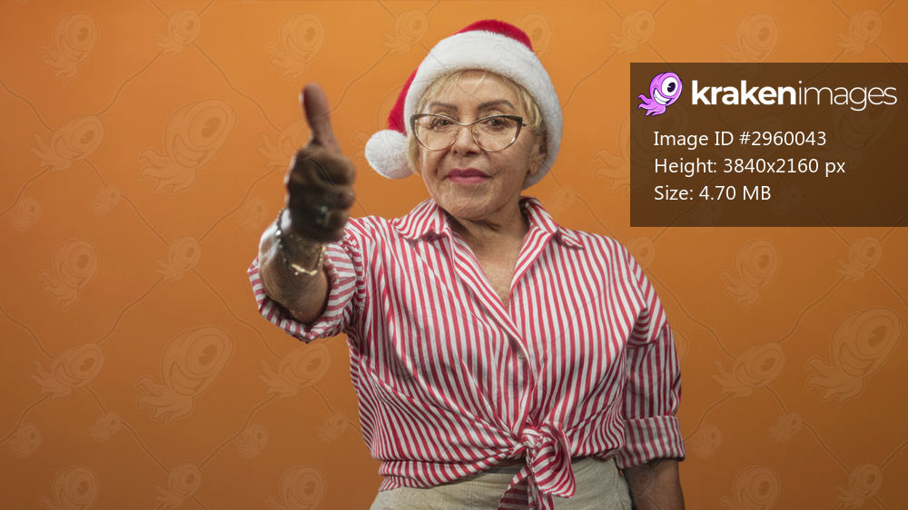 Woman wearing santa hat, glasses and a red striped shirt shows thumbs up with visible thumb in studio orange backdrop; festive joy.