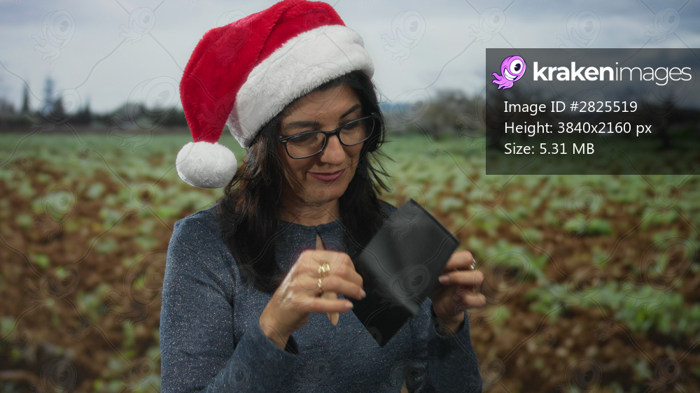 Woman wearing santa hat and glasses holds open empty wallet with both hands in a green park; disappointment.