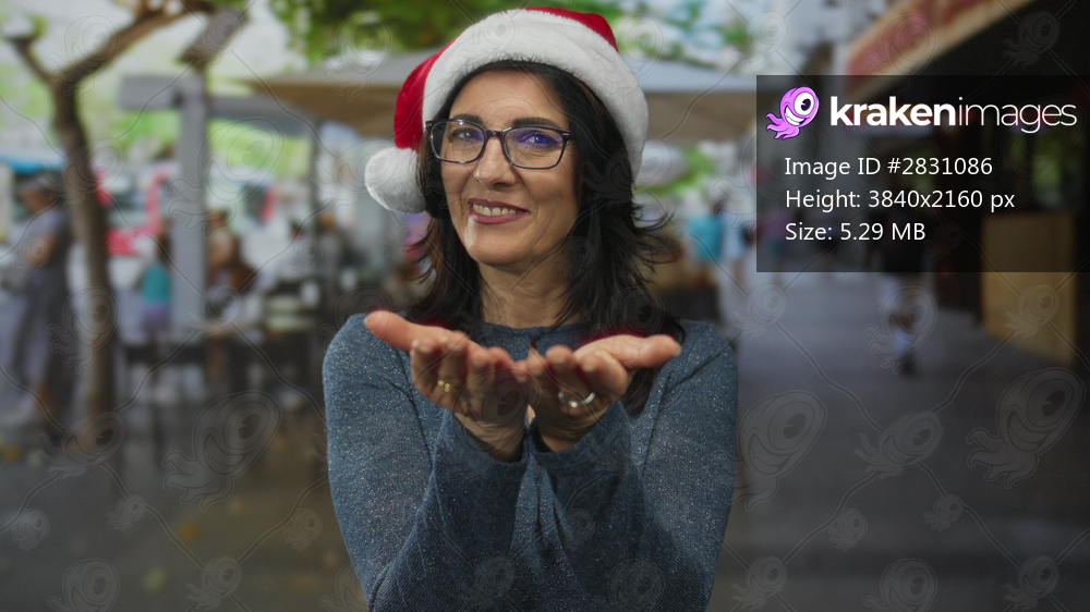 Woman wearing santa hat and glasses holds out cupped hands on outdoor terrace with blurred street view; invitation.