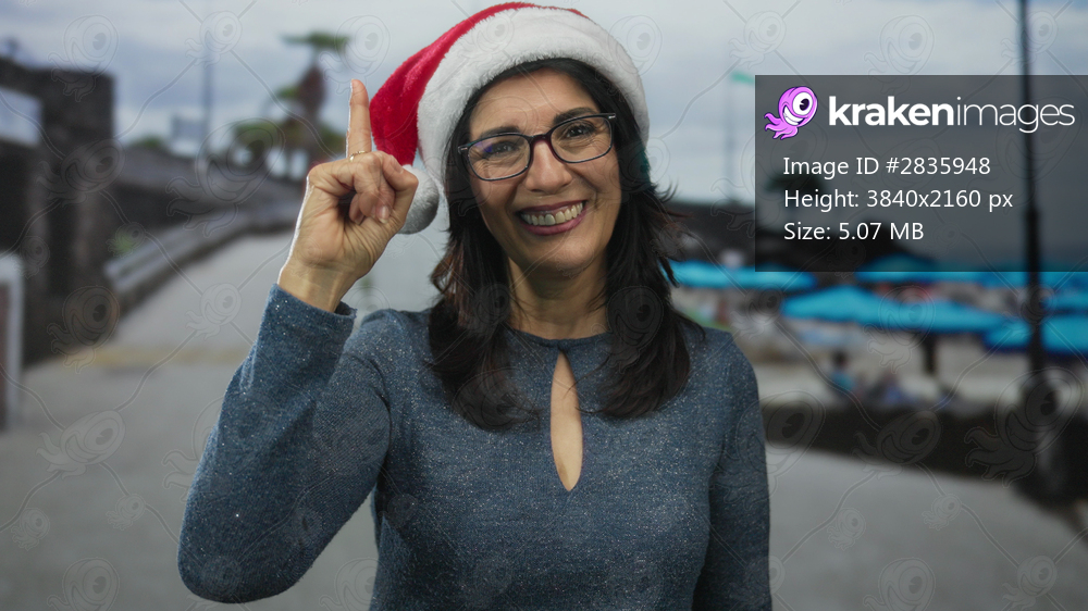 Woman wearing santa hat and glasses points finger upward on beach walkway by seaside umbrellas; holiday cheer.
