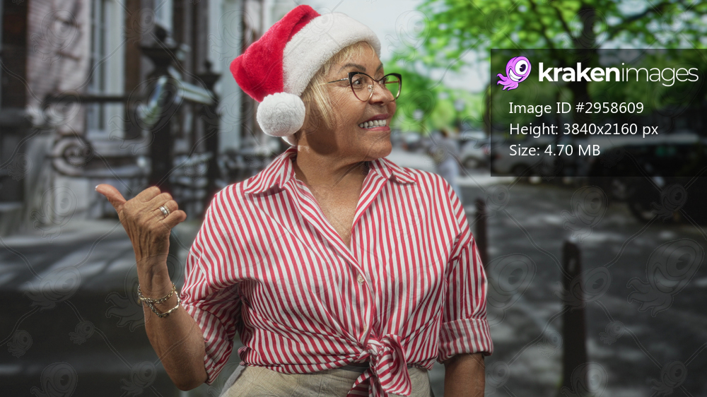 Woman wearing santa hat and glasses points thumb over shoulder on a leafy city street while smiling in a striped tied shirt and beige trousers; holiday joy. - Kraken Images