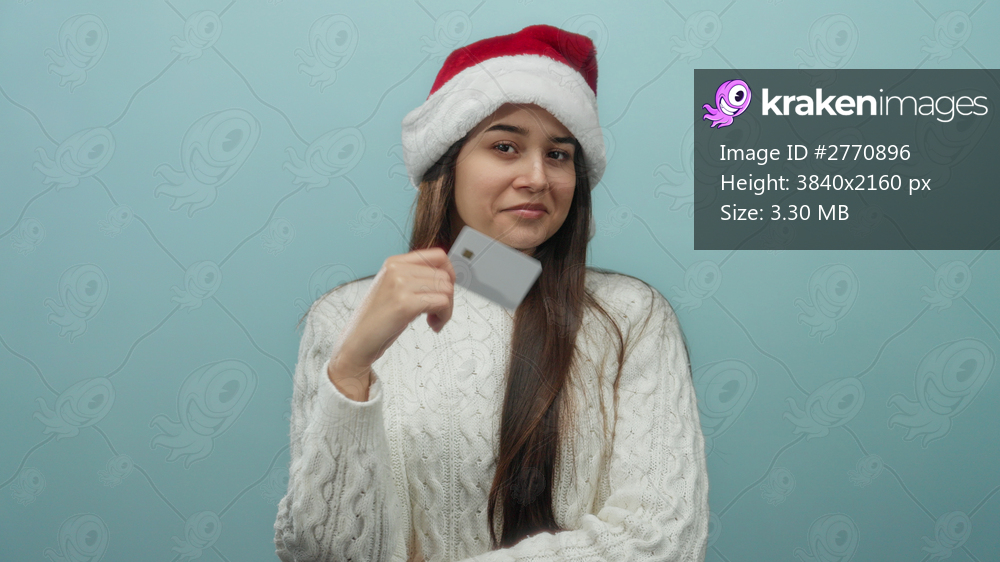 Woman wearing santa hat holding credit card against blue background showcasing holiday shopping concept with smiling expression and festive attire