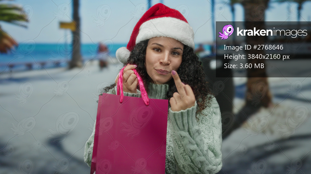 Woman wearing santa hat holding pink gift bag on promenade near beach showcasing playful gesture against sea backdrop in sunny weather