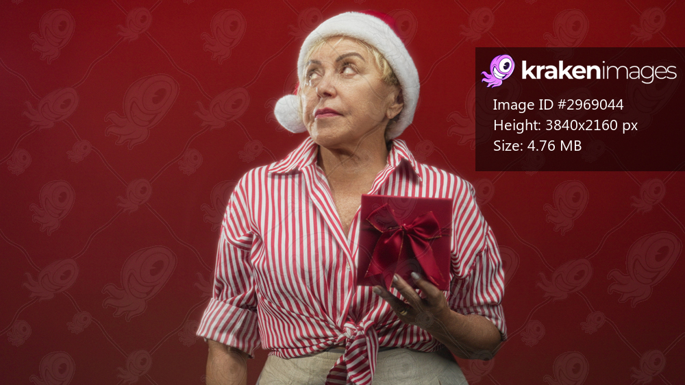 Woman wearing santa hat holding red gift box with hand on abdomen, looking up in studio against red backdrop; holiday nostalgia.