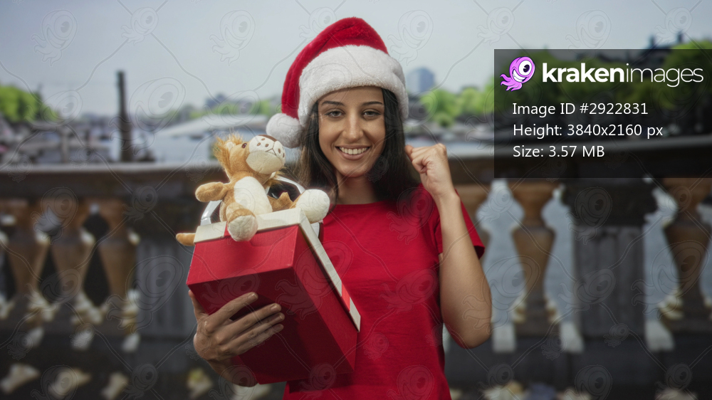 Woman wearing santa hat holding red gift box on a street with canal balustrade, fist pump gesture; holiday giving joy.