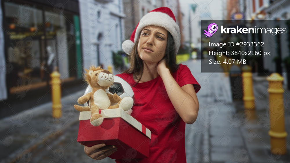 Woman wearing santa hat holding red gift box and plush lion with hand on neck in street; holiday fatigue.