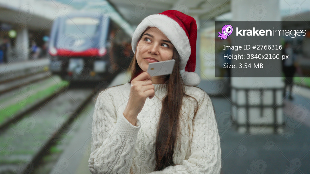 Woman wearing santa hat holds card on train station platform, smiling in festive outdoor setting.