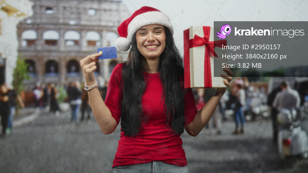 Woman wearing santa hat holds creditcard in hand and gift box on street in front of ancient colosseum, smiling and presenting both; festive joy.