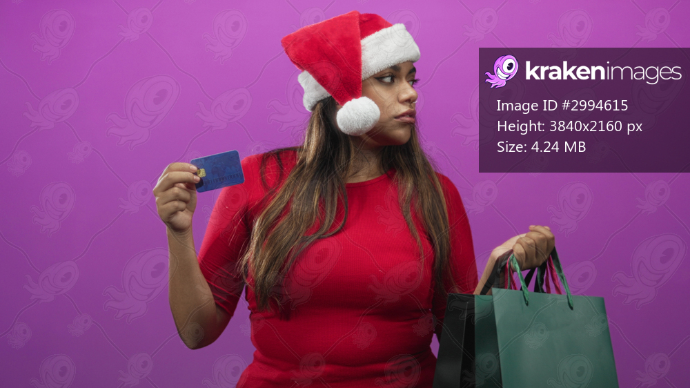 Woman wearing santa hat holds creditcard and shopping bags in studio with purple background; holiday indecision.