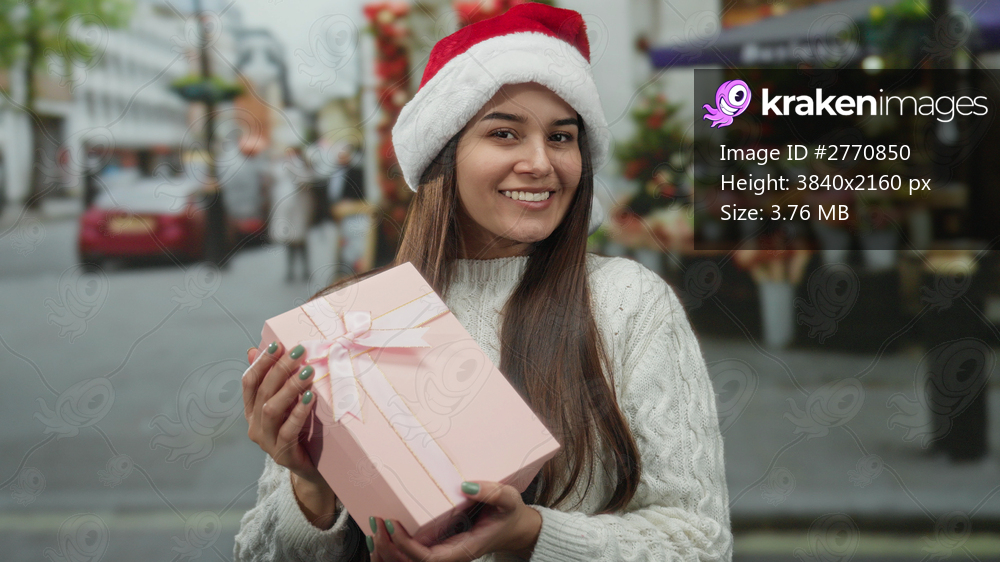 Woman wearing santa hat holds gift on festive outdoor street with flower shop background showcasing holiday spirit.