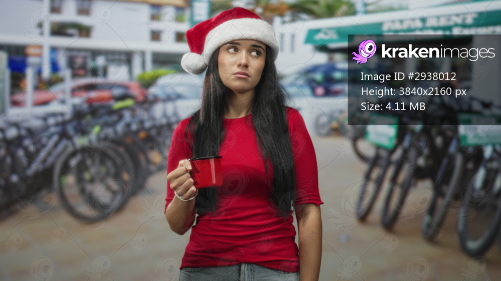 Woman wearing santa hat holds red mug in right hand, pensive expression while standing by a bike rack on street; quiet melancholy.