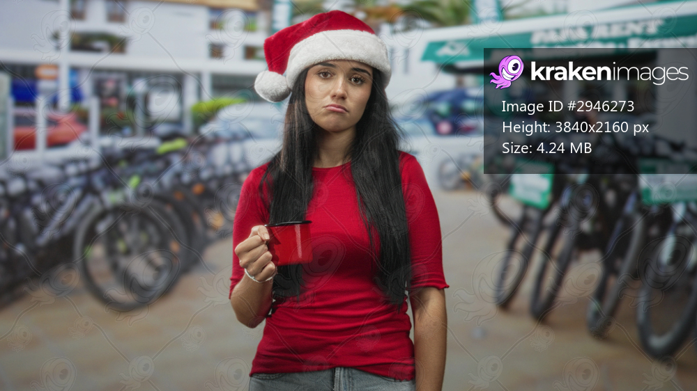 Woman wearing santa hat holds red mug in right hand, pensive expression while standing by a bike rack on street; quiet melancholy.