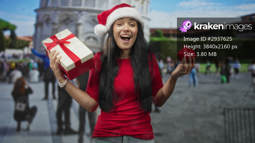 Woman wearing santa hat holds red piggy bank in right hand and white gift box with red ribbon in left while posing before a building; holiday savings joy. - Kraken Images