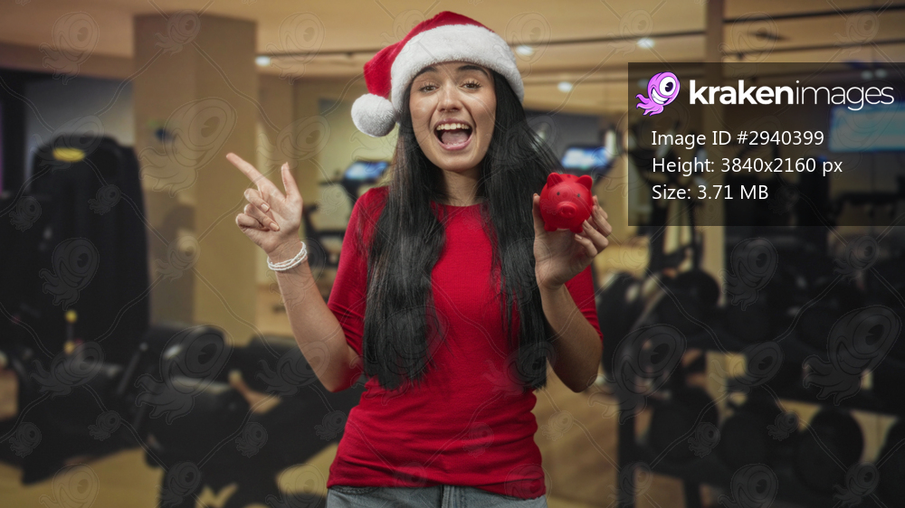 Woman wearing santa hat holds red piggy bank and makes a peace sign in a gym building, smiling with eyes closed and relaxed posture; holiday cheer.