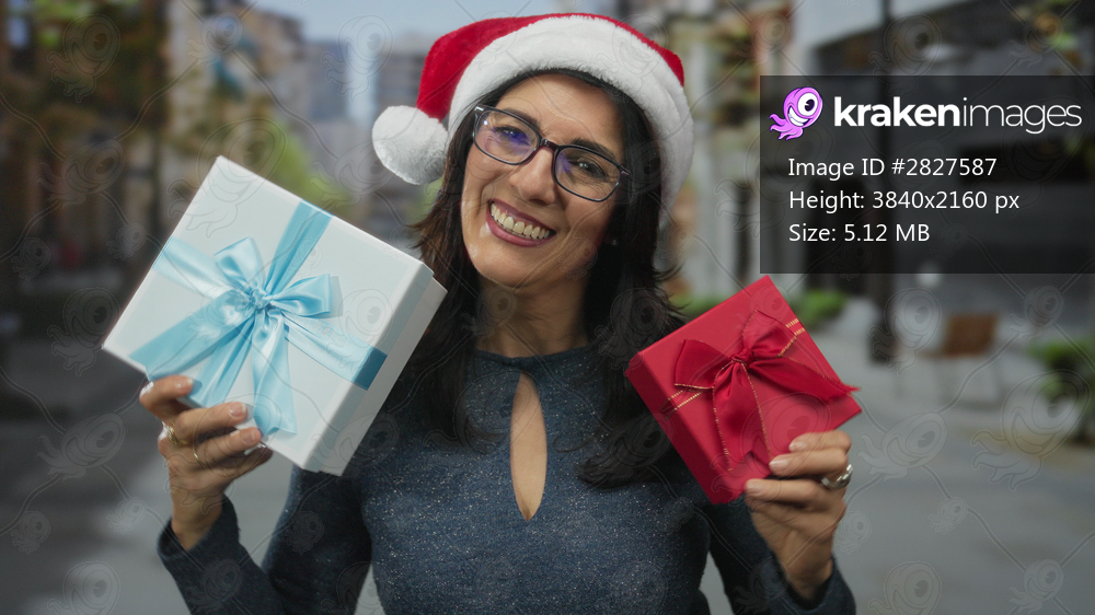 Woman wearing santa hat holds two gift boxes in both hands on bustling urban street lined with buildings; holiday joy.
