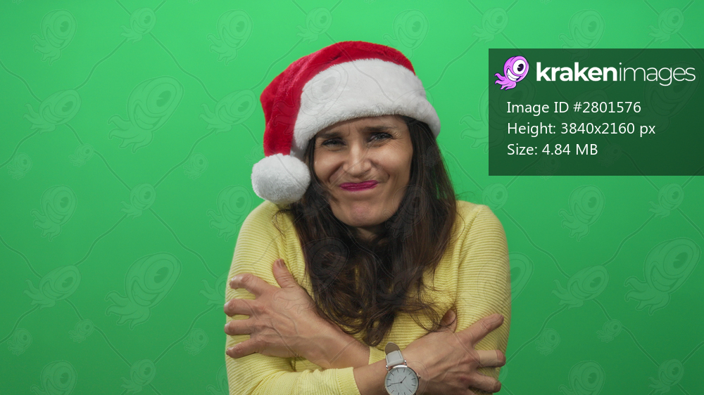 Woman wearing santa hat hugging bare arms in isolated green screen studio; coldness discomfort holiday.