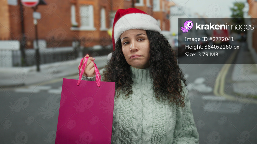Woman wearing santa hat looks puzzled holding pink shopping bag on urban street in winter holiday season.