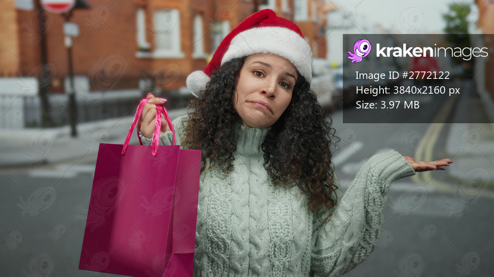 Woman wearing santa hat looks puzzled holding pink shopping bag on urban street in winter holiday season.