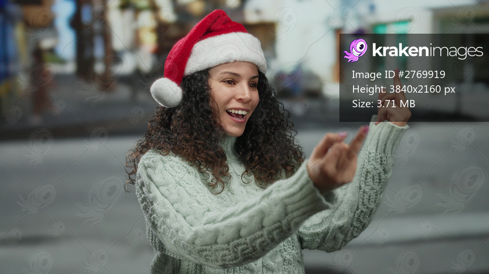 Woman wearing santa hat makes playful gestures in cheerful street setting during holiday season, expressing joy with festive attire and lively demeanor outdoors. - Kraken Images