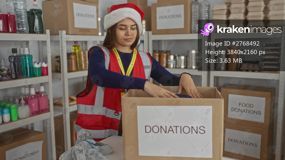Woman wearing santa hat packing donations in charity center surrounded by boxes and products to help those in need during the festive season indoors.