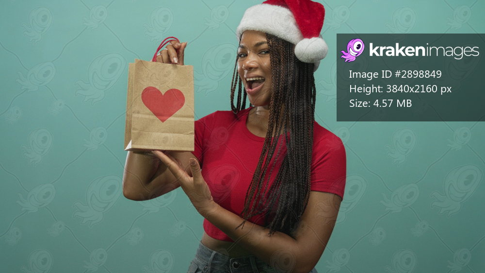 Woman wearing santa hat pointing finger at paper gift bag with red heart in teal studio; holiday joy gifting.