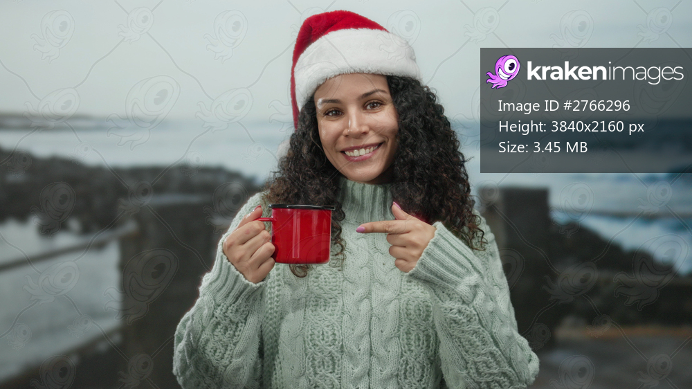 Woman wearing santa hat points at red mug by the beach, showing joy by the sea in a casual sweater, blending holiday cheer with coastal relaxation.