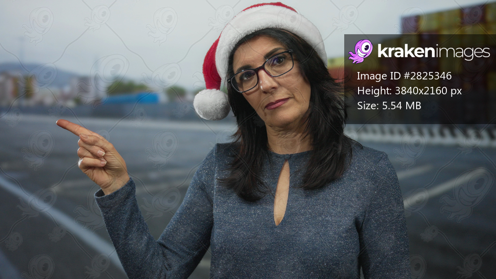 Woman wearing santa hat points finger to the side in building near shipping containers and pavement pointing gesture; rejection.