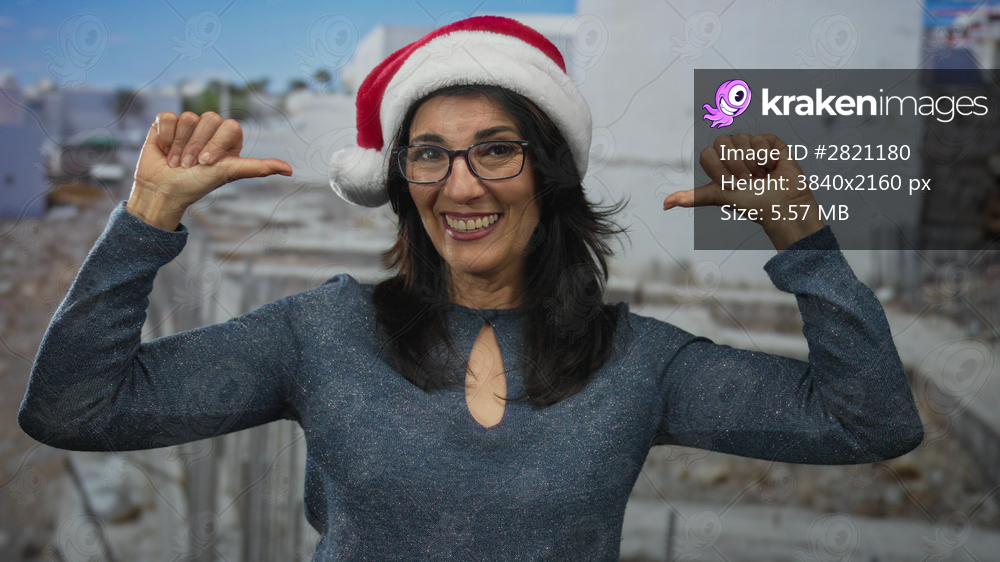 Woman wearing santa hat raises fists at construction site outdoors with broad smile under sunny sky; holiday cheer.