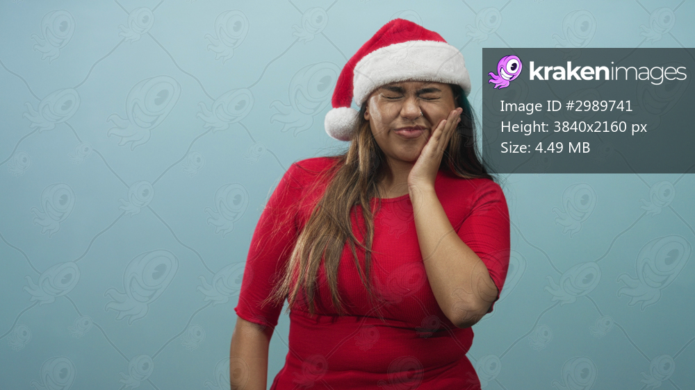 Woman wearing santa hat and red dress presses right hand to cheek and winces in studio, visible tooth pain against pale blue wall; toothache pain.