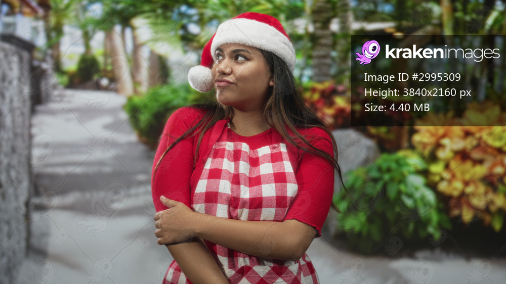 Woman wearing santa hat and red gingham apron, arms crossed holding elbow while gazing sideways in studio holiday set; playful holiday mood.