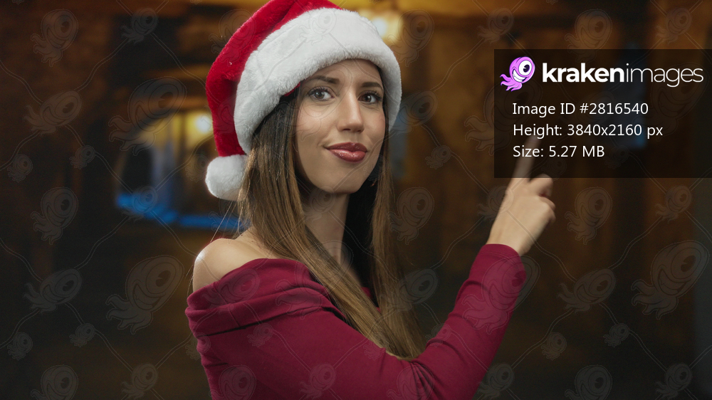 Woman wearing santa hat and red off shoulder top pointing finger toward unseen focus on a dimly lit old town street with stone arches; holiday joy.