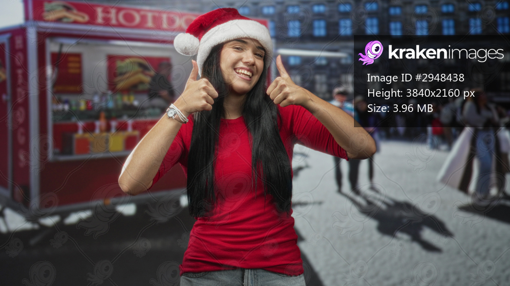 Woman wearing santa hat and red shirt gives thumbs up on a busy city street beside a hotdog cart; holiday cheer joy.