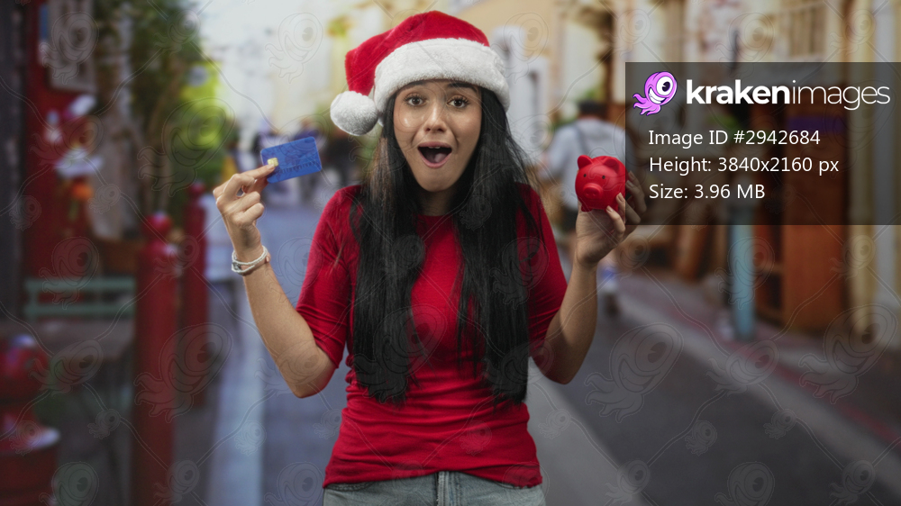 Woman wearing santa hat and red shirt holds a blue creditcard in left hand and a red piggybank in right hand on a street; holiday budget concern.