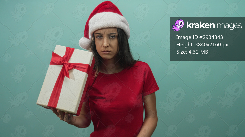 Woman wearing santa hat and red shirt holds wrapped gift box and points finger in a mint green studio; disapproval holiday warning.
