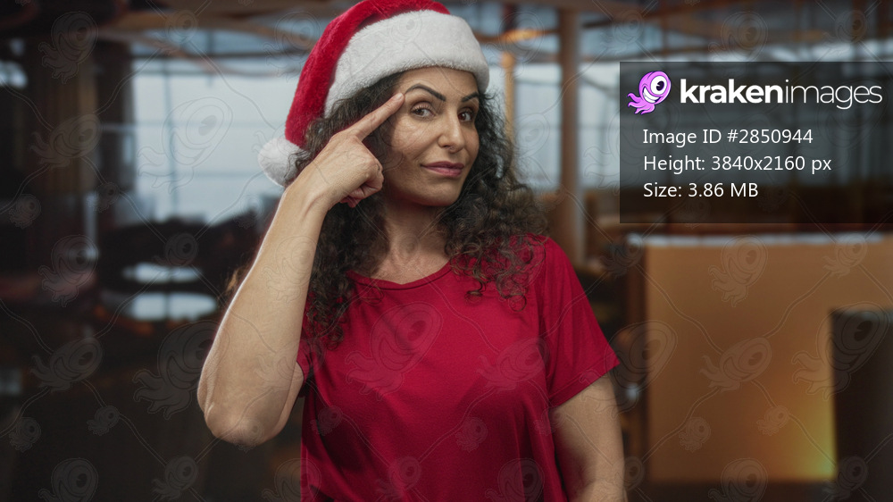 Woman wearing santa hat and red shirt points finger to head in hotel building; thinking curiosity mental exploration.