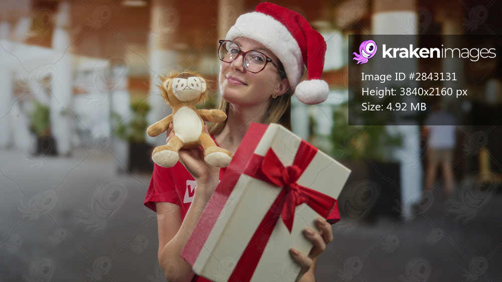 Woman wearing santa hat smiles and holds gift box and plush toy in building; holiday generosity giving.