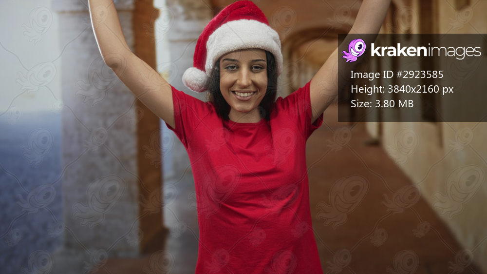 Woman wearing santa hat smiling and raising both hands in an old town building corridor archway; holiday cheer joy celebration.