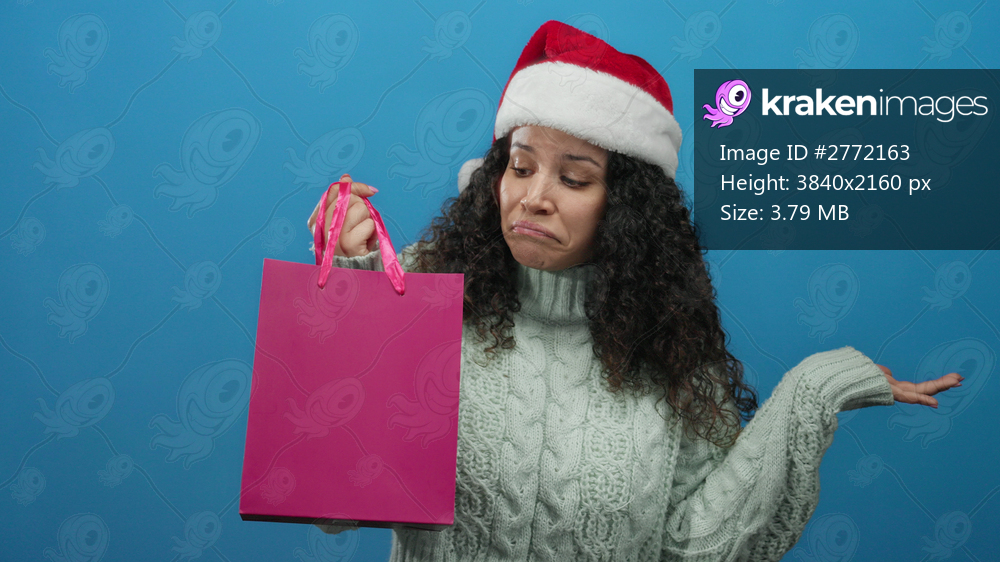 Woman wearing santa hat and sweater holds pink shopping bag with confused expression in front of blue background indicating holiday shopping dilemma.