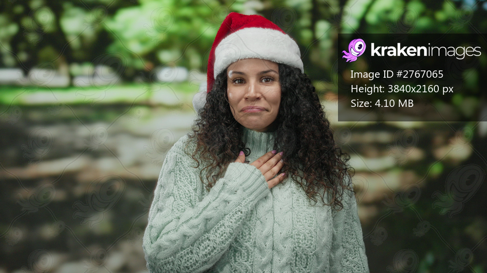 Woman wearing santa hat and sweater in a green park during christmas in daylight, expressing emotions with curly hair and hispanic heritage.