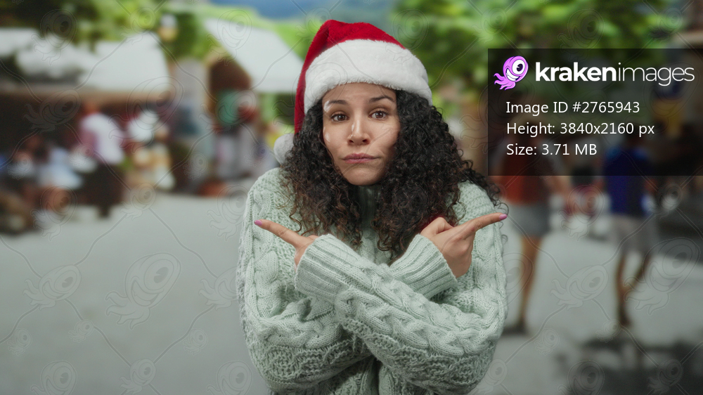 Woman wearing santa hat and sweater smiles and gestures cheerfully outdoors on a bustling street with trees and blurred people in background during daytime shopping - Kraken Images