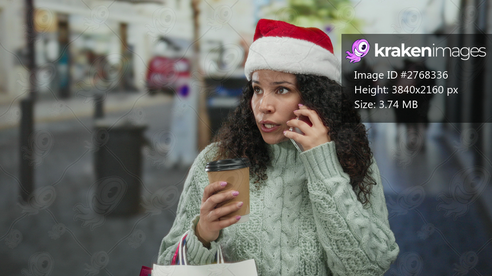 Woman wearing santa hat and sweater talks on phone holding coffee and shopping bags on a bustling city street.