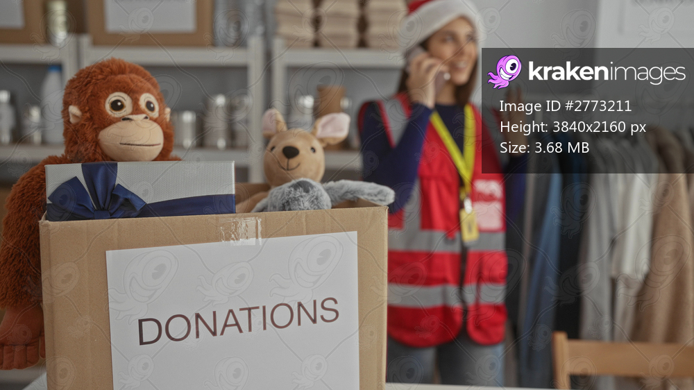 Woman wearing santa hat talking on phone in charity center with donation box filled with stuffed toys indicating holiday giving spirit indoors.