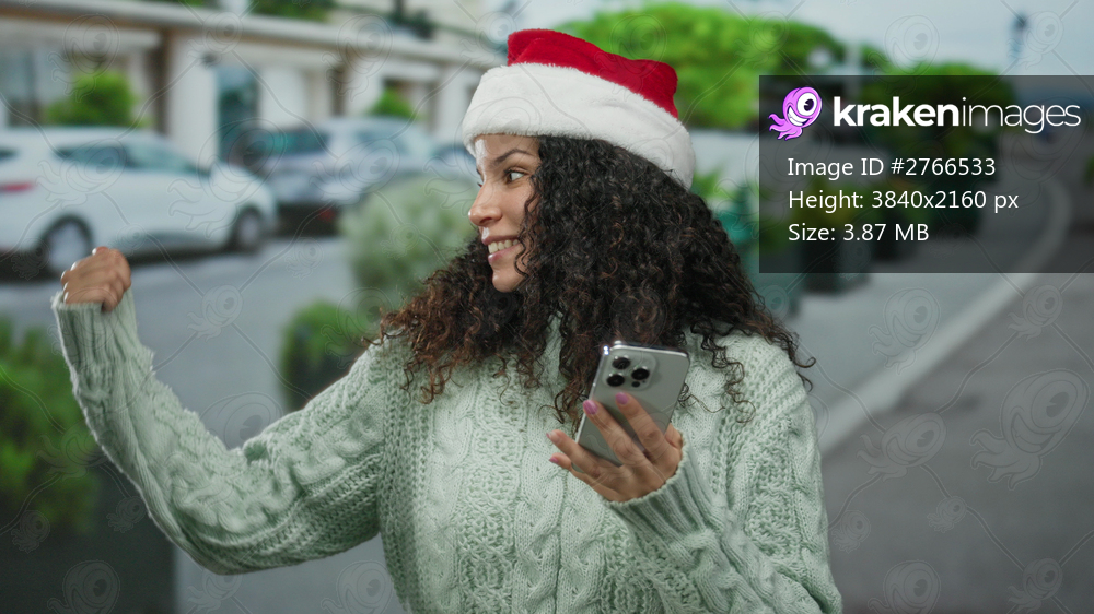 Woman wearing santa hat using smartphone on lively outdoor street, smiling and pointing backward in urban setting surrounded by greenery and parked cars. - Kraken Images