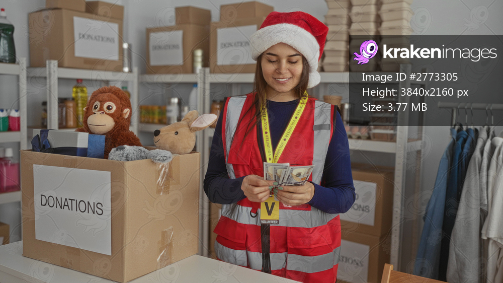 Woman wearing santa hat and vest, counting us dollars in charity donation center with toys around, creating a festive and generous atmosphere.