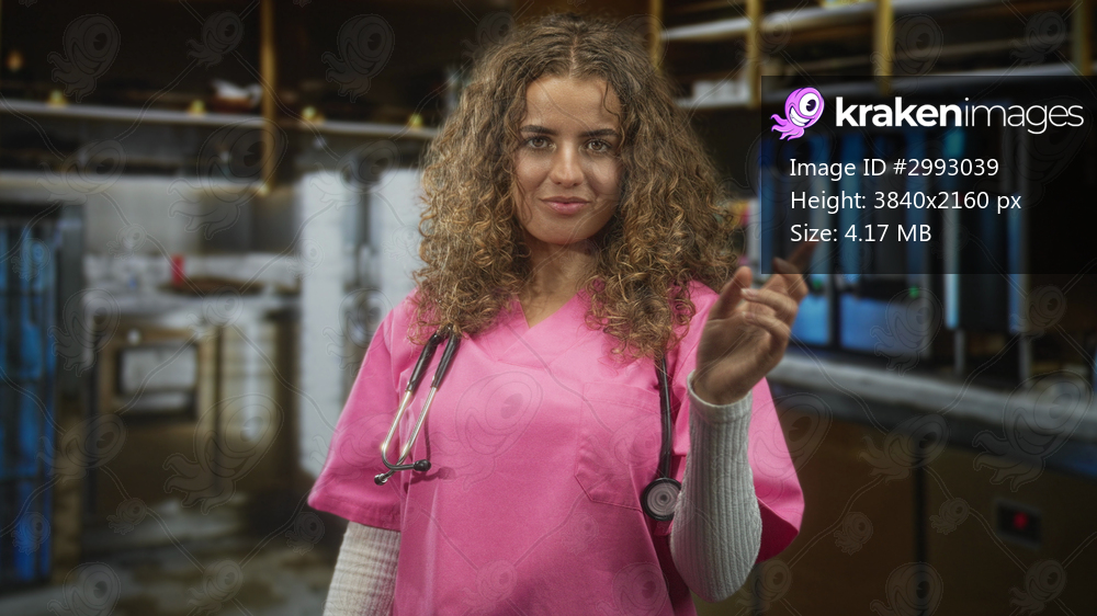 Woman wearing scrubs and stethoscope pointing with hand inside a hospital building breakroom counter area; confidence care competence.